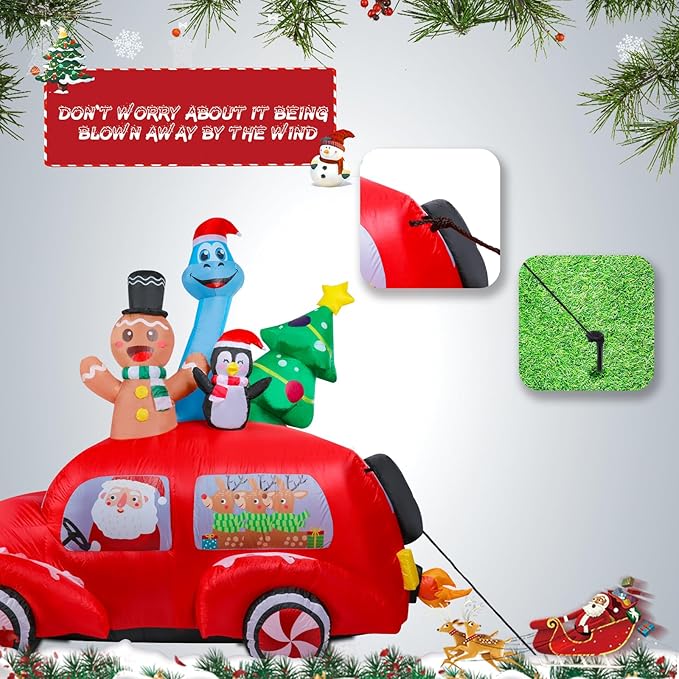 - 7.5ft long giant inflatable car carring penguin,gingerbread man, dinosaur, reindeers, Christmas tree and Santa Claus is very cute and attractive Christmas blow up yard outdoor decorations in your yard to create a festive atmosphere