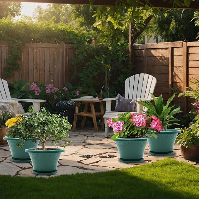 Quarut 12 Inch Plant Pot,4 Pack Large pots for Plants,Flower Pots with Drainage Hole & Saucer,Modern Planters for Indoor Outdoor Plants,Decorative Resin Garden Pots,Green