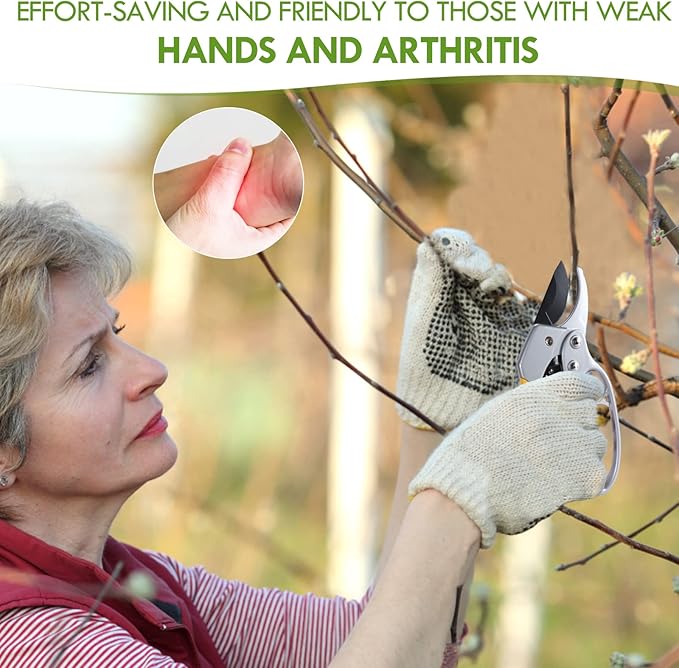 - 💓PRUNING THICK AND THIN BRANCHES IS ALSO EXCELLENT: Our professional garden scissors handheld are great for pruning and general gardening tasks. The ratchet structure and the built-in return spring make us efficient and effortless, making it easy for us to trim, even for arthritis sufferers or those with weak hands