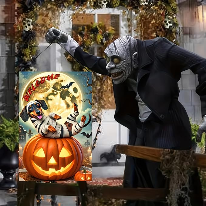 - Wide Application: This Trick or Treat Dachshund Garden Flag is ideal for decorating your garden, patio, front yard, deck, porch, lawn, backyard, or veranda this Halloween. This wiener dog decor will add life and charm to your outdoor space.