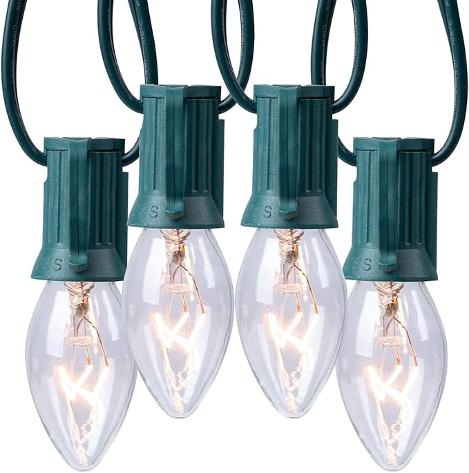 - 【𝐁𝐫𝐢𝐠𝐡𝐭 & 𝐖𝐚𝐫𝐦 𝐋𝐢𝐠𝐡𝐭】 C9 Christmas lights use a candelabra (E17) base. Each classic C9 bulb draws 7 watts, so even if one goes out, it won't affect the entire string. The bright glow of these Christmas lights C9 can illuminate any desired decoration, while their warm, delicate glow exudes a classic Christmas romance, making them a must-have for Christmas!