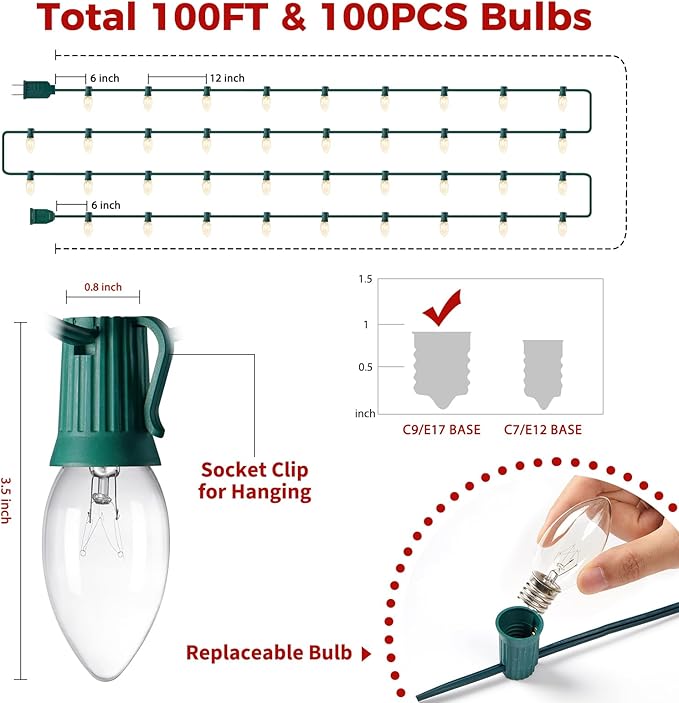 - 【𝐂𝟗 𝐂𝐥𝐞𝐚𝐫 𝐂𝐡𝐫𝐢𝐬𝐭𝐦𝐚𝐬 𝐒𝐭𝐫𝐢𝐧𝐠 𝐋𝐢𝐠𝐡𝐭𝐬】 C9 outdoor Christmas lights come with 100 C9 clear warm-color bulbs, a 6-inch lead with a male plug, 12-inch spacing between bulbs, and a 6-inch tail light with a female connector. The outdoor Christmas lights are 99 feet long and 100 feet long overall. It will bring you a warm and cozy Christmas!