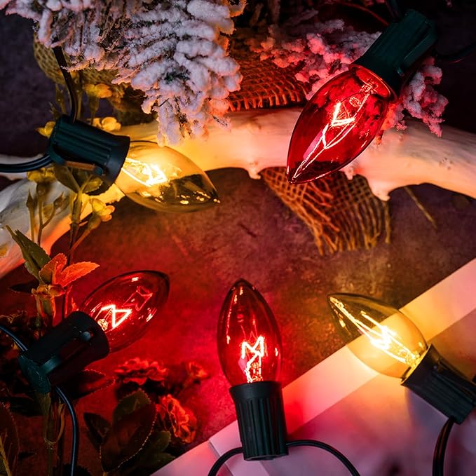 - 【𝐁𝐫𝐢𝐠𝐡𝐭 & 𝐖𝐚𝐫𝐦 𝐋𝐢𝐠𝐡𝐭】 C9 Christmas lights use a candelabra (E17) base. Each classic C9 bulb draws 7 watts, so even if one goes out, it won't affect the entire string. The bright glow of these Christmas lights C9 can illuminate any desired decoration, while their warm, delicate glow exudes a classic Christmas romance, making them a must-have for Christmas!