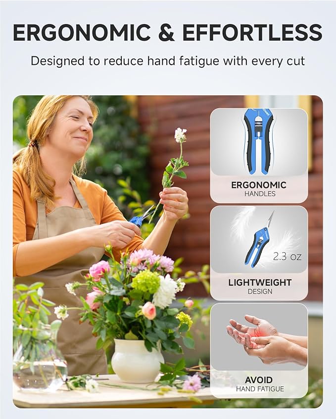 - Key Features: Engineered for ergonomic comfort, these pruning shears deliver clean, precise cuts while minimizing hand fatigue