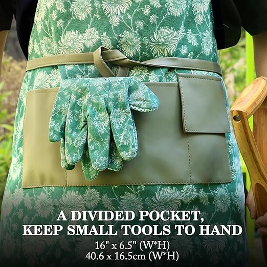 - ELEGANT COTTON APRON -- the apron is in a generous size 28" X 25" (H*W). It features adjustable neck strap and extra-long waist straps(28’’ each side) that can be wrapped round and tied up at the front for a snug fit. Additionally, there's a handy divided pocket sized 16" x 6.5" (W*H) to keep small tools to hand. If you have any questions or need assistance, please don't hesitate to contact us. We are always here to help.