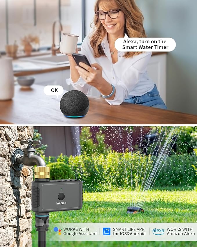 - 【Smart Voice Control】 The Smart WiFi Timer is compatible with Alexa and Google Assistant, so when you're too busy with other tasks to operate your phone, you can turn the watering timer on or off with a simple voice command. Enjoy the convenience of controlling your watering system with your voice