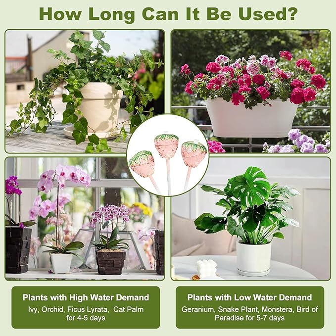 - 【Large Capacity, More Durable】Each set has 2 glass strawberry plant self watering devices, each with a capacity of 180ML. The water flow rate of the water bulb varies depending on the state of the soil and the water requirement of the plant, and the typical usage duration is 3-7 days.Tips: Please water the plants before and after using the watering ball. If your pot is larger, we recommend using 2 or 3 plant globes at the same time.