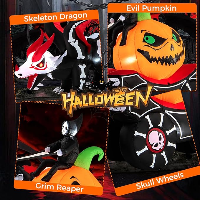 - Giant Halloween Display: The grim reaper sits atop an evil pumpkin, driving a carriage adorned with a skeleton dragon and skull wheels. Standing at 9 feet long and 5.7 feet high, this inflatable decoration is a massive addition to your Halloween celebrations.