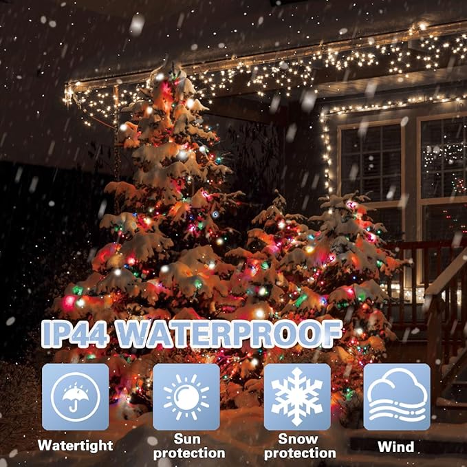 - Waterproof Outdoor String Lights: Our 100 LED waterproof string light has passed IP44 waterproof certification, it can resist water, perfect for indoor outdoor decorations, don't worry about using it in heavy rain and heavy snow, but warm tips please protect the plug.