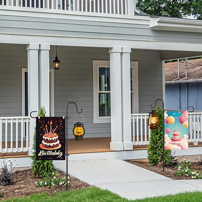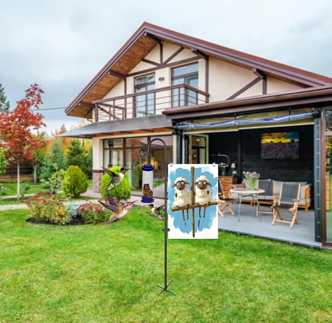 - Multi Purpose: Our garden flag stand holds the standard size small flags perfectly More suitable 12x18 inches (max to 12.5'' wide), garden flags, American flags, various holiday poster flags and your favorite flags, cemetery anniversary garden flags. On the shepherd's hook on the other side, hang what you want to hang, wind chimes, garden lights, solar lights, bird feeders, lanterns, small baskets, bird baths, flower pots