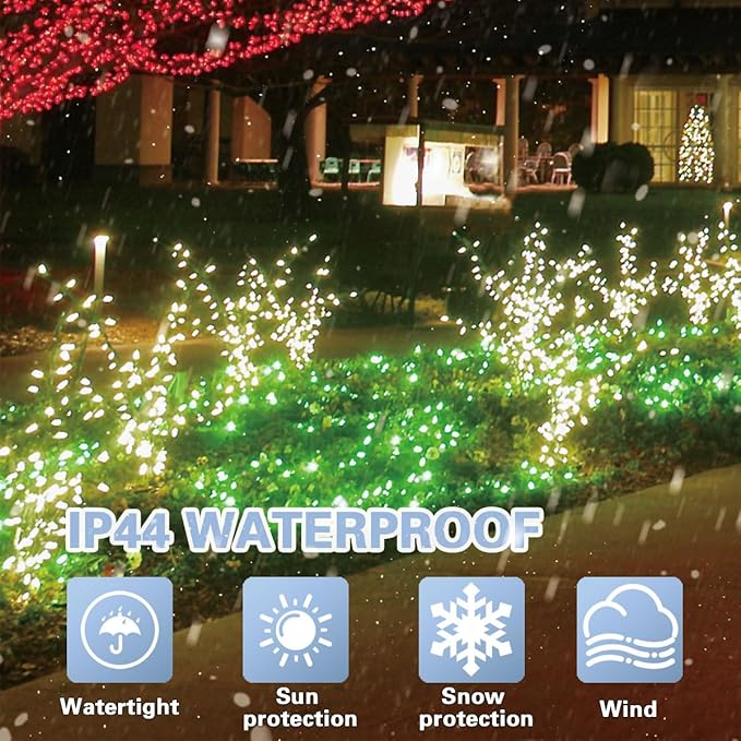 - Waterproof Outdoor String Lights: Our 200 LED waterproof string light has passed IP44 waterproof certification, it can resist water, perfect for indoor outdoor decorations, don't worry about using it in heavy rain and heavy snow, but warm tips please protect the plug.