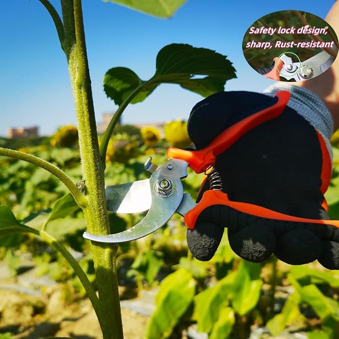 - [Pruning Shears] Stainless-steel blade are sharp and durable for easy and smooth cut. Anti-slip and ergonomic handle make the gardener clippers more comfortable in your hand. Easy-open spring action reduces hand fatigue while cutting. These garden shears have User-friendly Safety Lock which locking mechanisms to keep the sharp blades securely closed when not in use. It is ideal for harvesting or trimming herbs, flowers, house plants, hydroponics, bonsai, and other cutting needs in the garden.