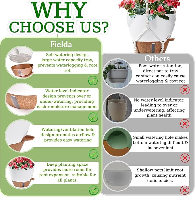 - 【Water Level Indicator Design】Unlike other hanging planters, Fielda hanging plant pot features an innovative design with a specially crafted visible window in the bottom tray, allowing you to monitor the water level at any time. This way, you can prevent plant damage from underwatering or overwatering with ease.