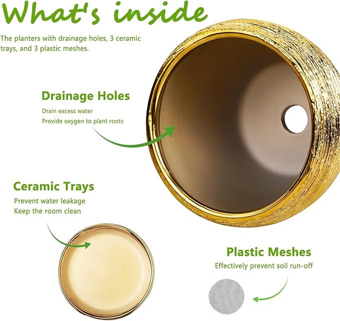 - High-quality Ceramic: These ceramic planters are made of high-quality ceramic forged at high temperatures for durability. The surface of gold planters is made of smooth glaze, which is very easy to clean
