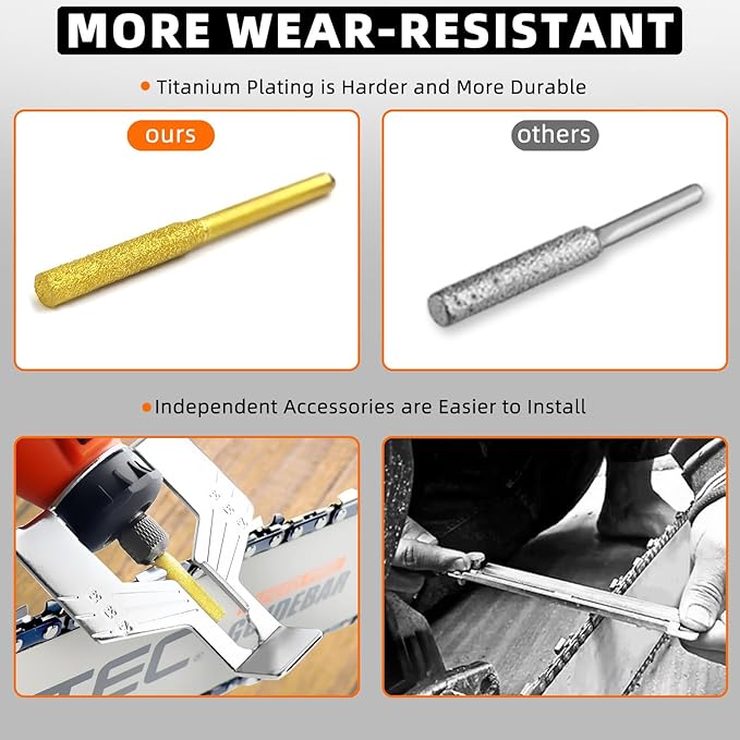 - 【Durable Titanium Sharpening Wheels】Equipped with high-quality titanium sharpening wheels: 2 * 5/32”(4.0mm), 2 * 3/16”(4.8mm), 2 * 7/32”(5.5mm), this chainsaw chain sharpener is built to last. The durable heads ensure consistent and precise sharpening, maintaining the sharpness and performance of your chainsaw chains