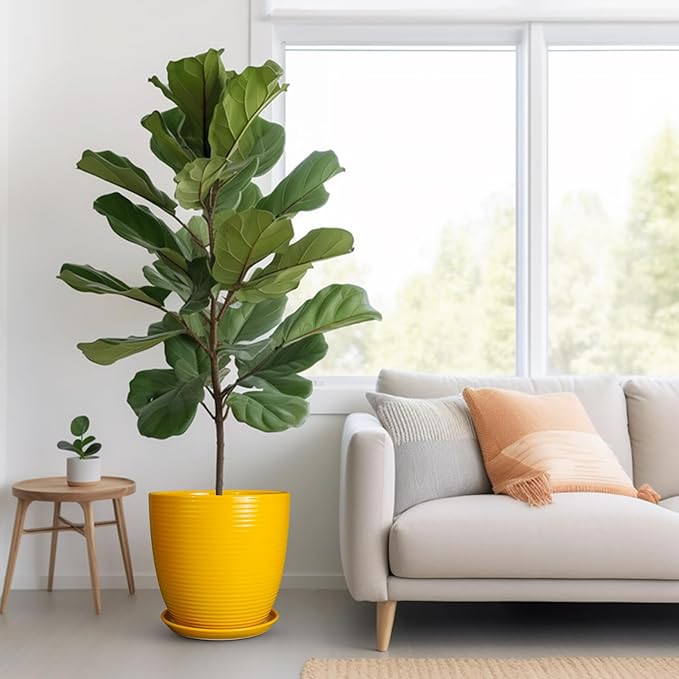 12 Inch Pots for Plants - Ceramic Planter for Indoor Plants Large Plant Pot with Drainage Hole and Saucer Round Outdoor Flower Pot for Garden Home Patio Office Yellow