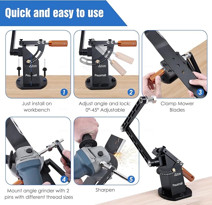 - 15°-45° Adjustable Frame: Our lawn mower blade sharpener features a versatile design with an adjustable frame, allowing you to set the sharpening angle between 15° and 45°. This enables precise sharpening for various blade types, ensuring optimal cutting performance.