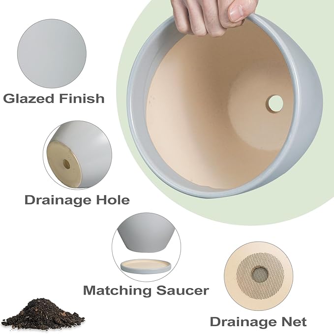 - Plant Pots with Drainage Holes and Saucers: The drainage holes can effectively remove excess water from the ceramic planter to avoid root rot; while the ceramic plant saucer can catch excess water seeping out from the bottom of the ceramic flower pot to keep the home environment tidy