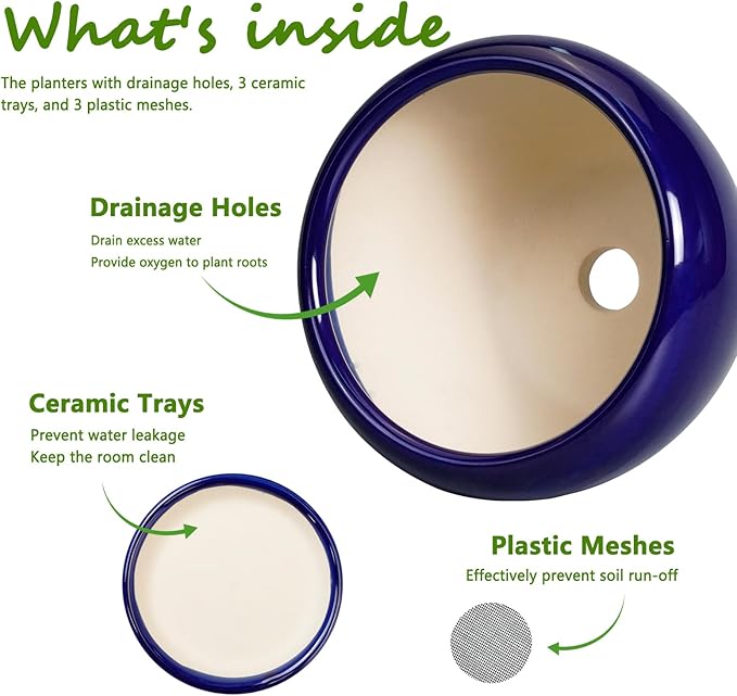 - Drainage Holes and Accessories: Each ceramic plant pot has a drainage hole at the bottom, a mesh, and a ceramic tray for collecting water. This will provide ample oxygen to the plants
