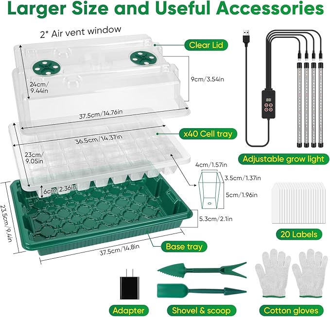 - 【360°Spectrum Grow Light】 Built-in way of grow light cover spectrum for better seedling grow, this product has upgraded 4 full spectrum strip plant growth lights insert on the Dome of the plant starter kit, and also has improve the light. Now you can adjust and timed the light as you need, you don’t have to stay at home ! White& blue&red grow Light will help seedling growing faster and better. You can use this product by USB port or just plug-in,having timing functions (1-24 hours timed ) & 5 brightness modes, providing a better garden tool for anyone!