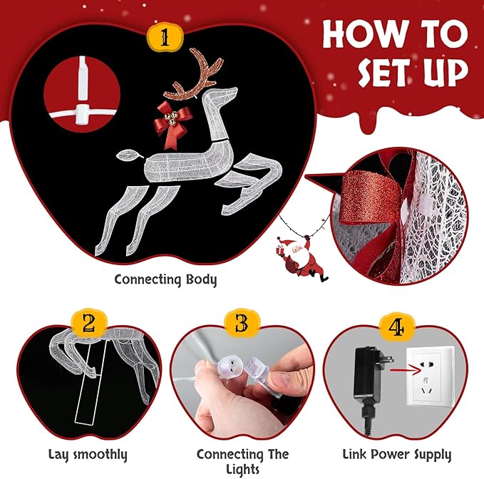- 🎄𝐄𝐚𝐬𝐲 𝐀𝐬𝐬𝐞𝐦𝐛𝐥𝐲 & 𝐂𝐨𝐧𝐯𝐞𝐧𝐢𝐞𝐧𝐭 𝐒𝐭𝐨𝐫𝐚𝐠𝐞: Designed for effortless setup, this foldable reindeer outdoor Christmas reindeer with lights can be put together in just a few minutes. The pre-installed lights make installation simple—connect the wires, plug it in, and enjoy the festive glow. When the season ends, fold it flat for space-saving storage.
