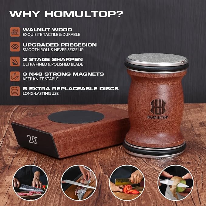 - Extreme Sharpness with Superior Discs: Featuring replaceable diamond and ceramic discs, the Homultop roller knife sharpener ensures precision and long lasting performance. The #400 diamond disc removes rough layers, the #1000 disc refines the edge with fine precision, and the #3000 ceramic disc adds a polished, mirror-like finish. Extra discs ensure years of reliable use.