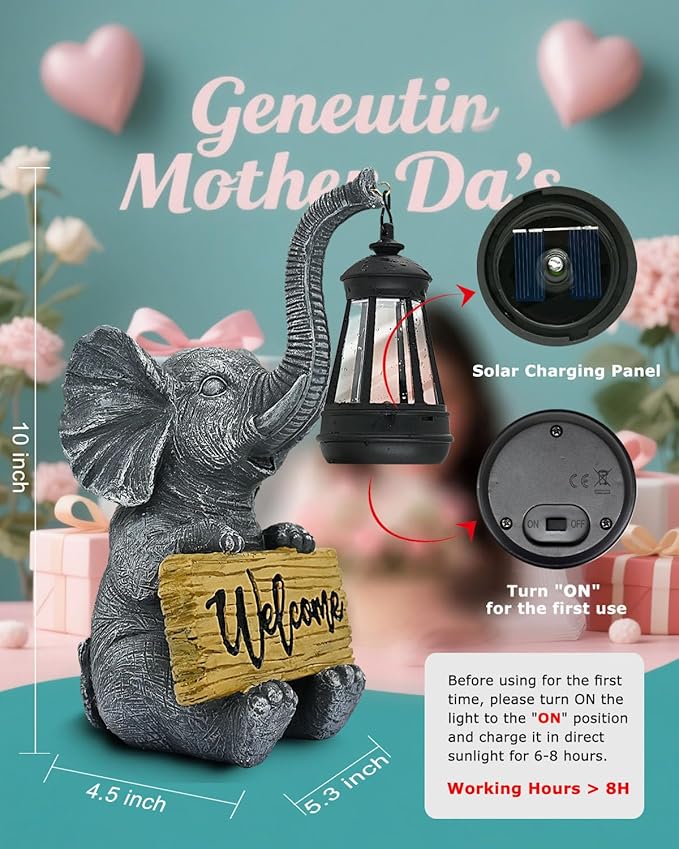 - Upgraded Solar Tech: This solar elephant garden light statue equipped reliable solar panel (21% energy conversion efficiency) and 600mAh battery. Provides 8+ hours of continuous illumination per full charge cycle.