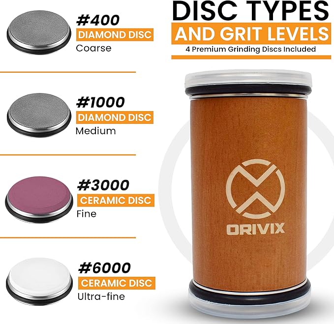 - 𝐈𝐧𝐜𝐥𝐮𝐝𝐞𝐬 𝟒 𝐆𝐫𝐢𝐭 𝐃𝐢𝐬𝐜𝐬 – 𝐃𝐢𝐚𝐦𝐨𝐧𝐝 & 𝐂𝐞𝐫𝐚𝐦𝐢𝐜: Our rolling sharpener Comes with 1000/400 grit diamond discs for reshaping dull edges and 6000/3000 ceramic discs for refining and polishing. Color-coded for ease: White = 6000 grit, Maroon = 3000 grit.