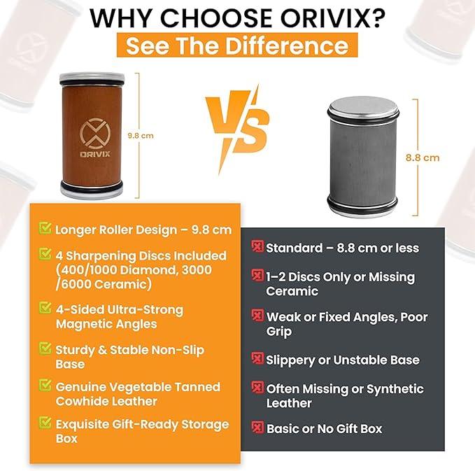 - 𝐏𝐫𝐞𝐦𝐢𝐮𝐦 𝐁𝐨𝐱 + 𝐎𝐑𝐈𝐕𝐈𝐗 𝐂𝐚𝐫𝐫𝐲𝐢𝐧𝐠 𝐂𝐚𝐬𝐞: Neatly packed in a sleek, branded gift box and a durable, zippered black carrying case with the ORIVIX logo. Perfect for organized storage, travel, or gifting to chefs, outdoorsmen, or knife enthusiasts.