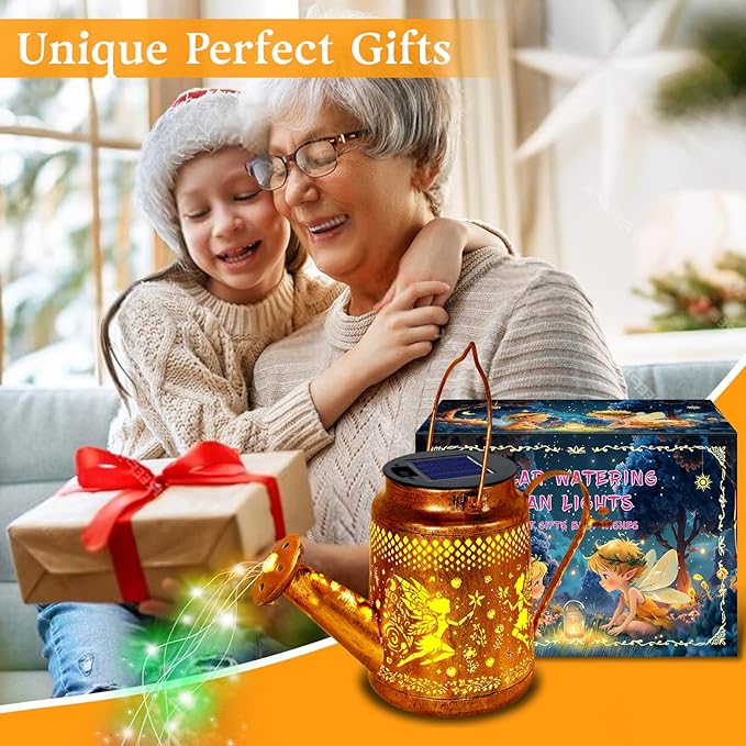 - Mom Gifts Solar Garden Lights -- This solar watering can with cascading lights is a perfect decoration for garden, yard, lawn, porch, patio, pathway, walkway, terrace, and balcony. You can place this outdoor decor for patio on the ground with the included Shepherd Hook to decorate your plants, vines, flower bed, or just hang it on a tree or placed on the tabletop
