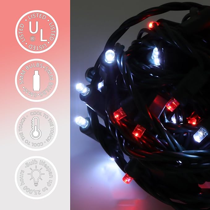 - Long-Lasting: Features 50 red and cool white 5mm LED wide-angle bulbs spaced 4 inches apart, providing a soft, uniform glow. Bulbs last up to 25,000 hours, with a sealed, one-piece construction that resists moisture and corrosion