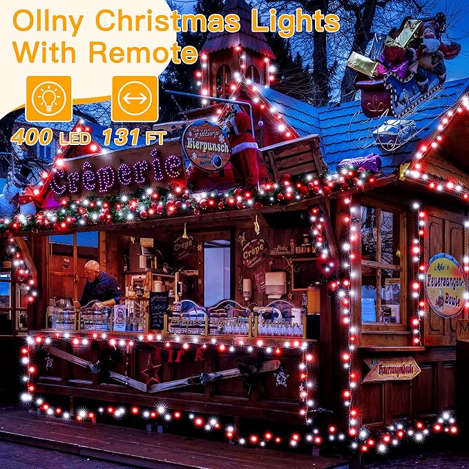 Ollny Red and White Christmas Lights Waterproof, 400LED 131FT String Lights with Remote 3 Timer, Plug in 8 Modes Fairy Light for Xmas Tree Indoor Bedroom House Party Wedding Decorations