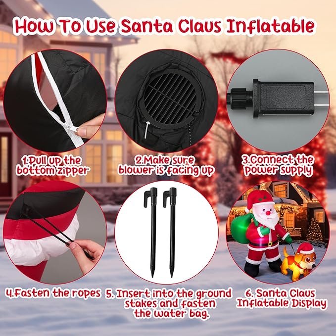 - Light up Your Night: this Christmas inflatable features Santa bringing with his dog, glowing with built-in bright LED lights; As night falls, the cheerful combination lights up your yard, spreading warmth, joy, and festive spirit to all who pass by