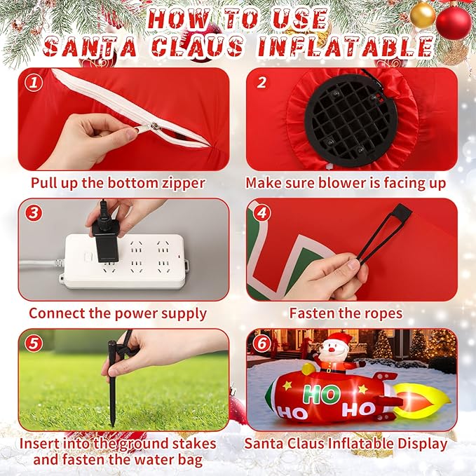 - Light up Your Night: this Christmas inflatable features Santa flying his airplane, glowing with built-in bright LED lights; As night falls, the cheerful Santa lights up your yard, spreading warmth, joy, and festive spirit to all who pass by