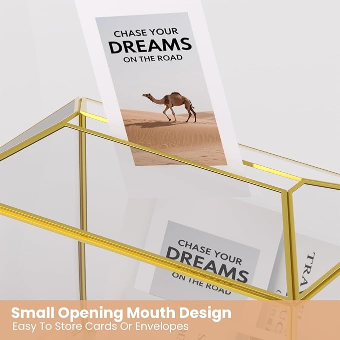 - VERSATILE DESIGN: Large gold terrarium card box with a slot on the top and a side lockable door, a heart-shape lock with key is included to ensures that the contents inside are safe and secure,perfect to use on the centerpiece for wedding or party, perfect size for gift cards, small jewelry, and other tiny presents.