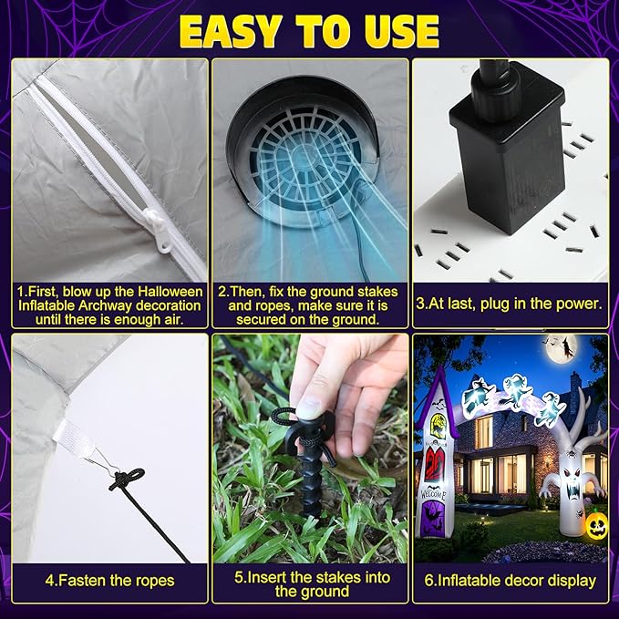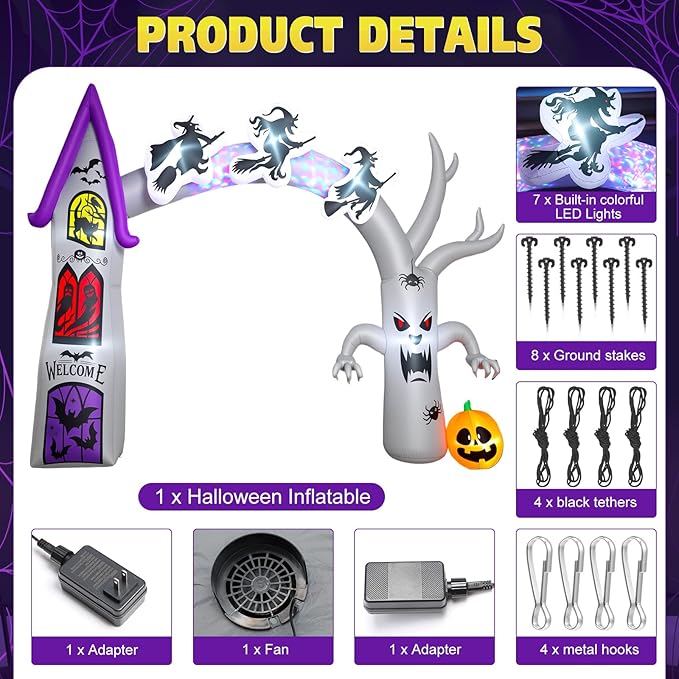 - Inflatable Halloween Archway: The Halloween inflatable archway comes complete with 8 ground stakes, 4 black tethers, 4 metal hooks, and a fan, ensuring easy and stable setup. Designed for hassle-free installation, the Halloween blow up archway remains securely in place, no matter the weather is