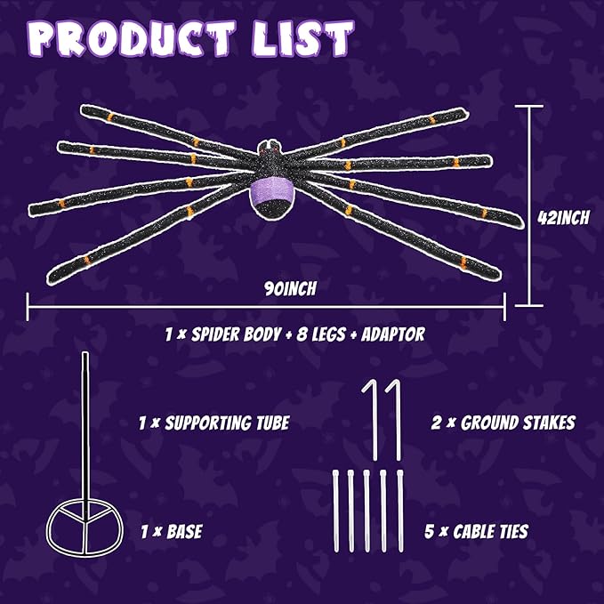 - 🔧 Effortless Setup Halloween Decorations: Package includes: 5ft power cord, cable ties, ground stakes, support tube & base—no tools needed.Assemble this massive scary spider (66" x 42" x 22") in minutes!