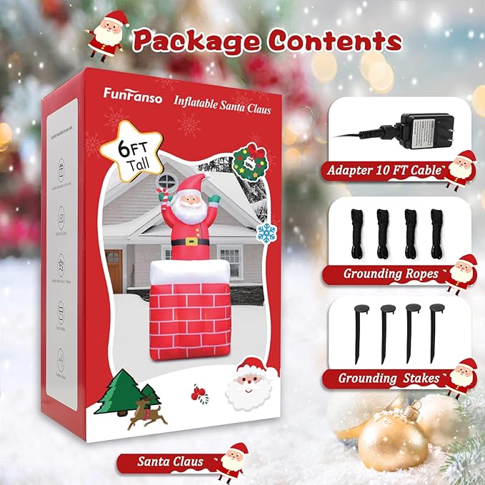 - 【𝘼𝙪𝙩𝙤𝙢𝙖𝙩𝙞𝙘 𝙐𝙥 𝙖𝙣𝙙 𝘿𝙤𝙬𝙣 𝙈𝙤𝙩𝙞𝙤𝙣】This 6FT christmas inflatable outdoor decoration simulates the classic scene of Santa Claus busy shuttling through the chimney. The automatic up and down design makes this scene vividly reproduced in your home, which greatly enhances the magical sense of the holiday season. Unlike traditional static Christmas decorations, it creates a striking visual highlight that allows every member of the family to experience the unexpected!