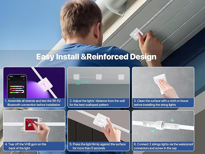- Easy to Install & Expandable Length: Use adhesive glue to install the lights quickly, or use screws to secure them. Multiple light strips are connectable, allowing you to easily cover large areas of the courtyard or room. If you encounter any problem during installation, please contact our after-sales service promptly. We will provide you with assistance within 24 hours