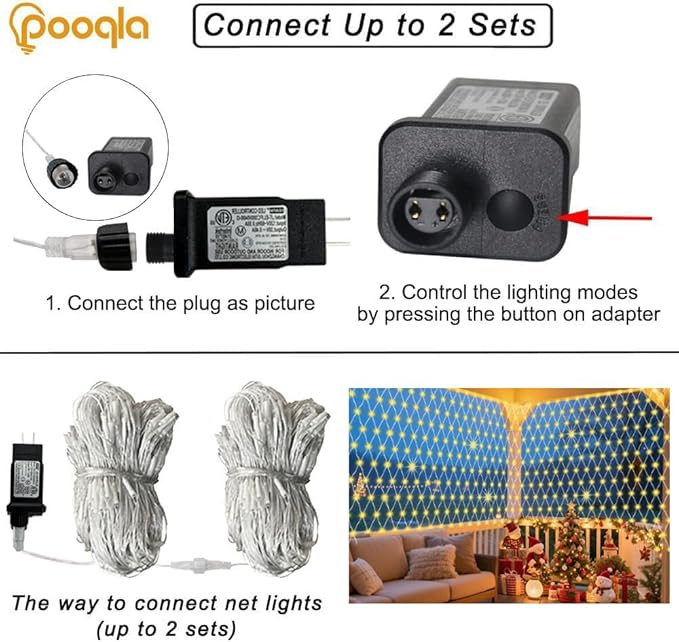 - Christmas Net Lights with 8 Lighting Modes: Combination, In Waves, Sequential, Slow Glow, Chasing/Flash, Slow fade, Twinkle/Flash, Steady on(No remote control). Press the button on the adapter to control the flashing modes