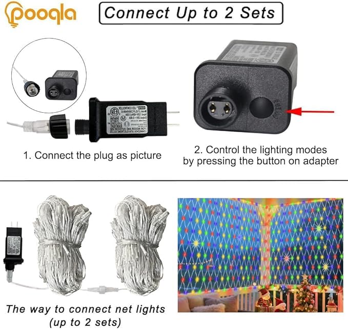 - Christmas Net Lights with 8 Lighting Modes: Combination, In Waves, Sequential, Slow Glow, Chasing/Flash, Slow fade, Twinkle/Flash, Steady on(No remote control). Press the button on the adapter to control the flashing modes