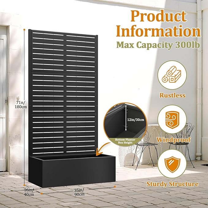 - 🛡️【Outdoor Privacy Screen & Metal Planter Box with Trellis】Use this metal planter box with trellis to create a natural divider on your patio, balcony, or yard. It’s more than just a garden raised bed for climbing plants—it’s also a beautiful metal planter with privacy screen that offers shade and separation. The sleek black frame and vertical lines of this metal planter box with trellis make it both decorative and practical.
