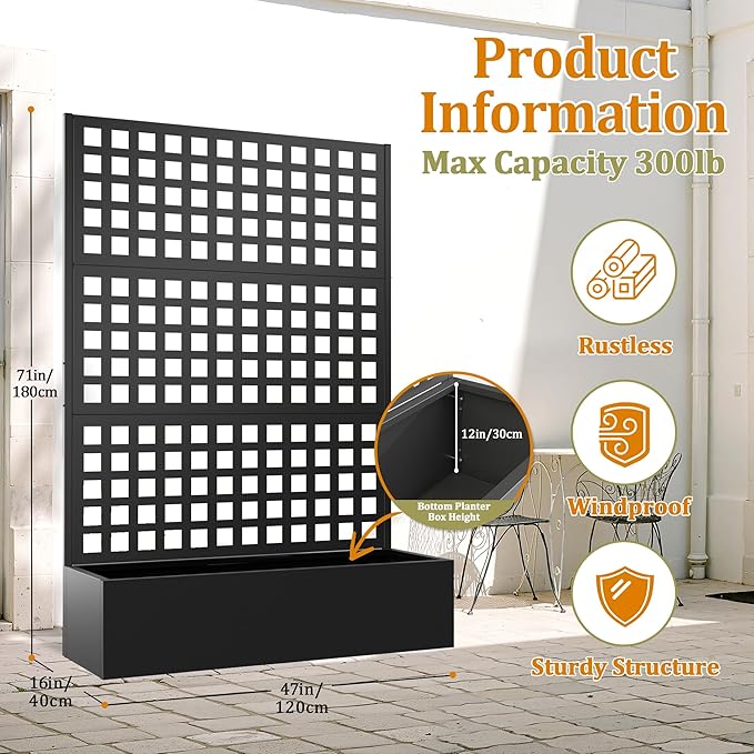 - 🛡️【Outdoor Privacy Screen & Metal Planter Box with Trellis】Use this metal planter box with trellis to create a natural divider on your patio, balcony, or yard. It’s more than just a garden raised bed for climbing plants—it’s also a beautiful metal planter with privacy screen that offers shade and separation. The sleek black frame and vertical lines of this metal planter box with trellis make it both decorative and practical.