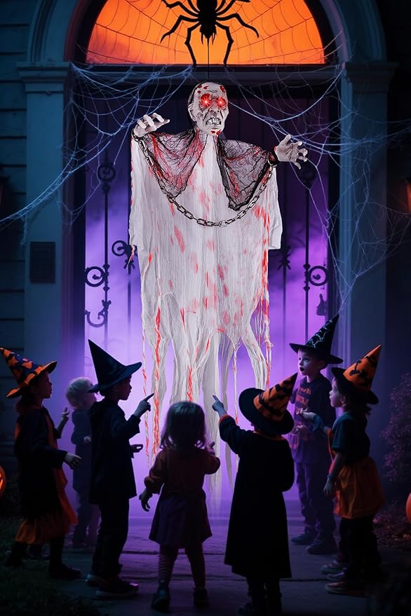 - Horrible Halloween Outdoor Decorations: Our Halloween animatronic prop, the Skeleton Flying Ghost, can be placed indoors or outdoors to surprise your trick-or-treating guests and friends. Ideal for Halloween outdoor decorations, festive courtyard decorations, it creates a ghostly and terrifying atmosphere for your Halloween parties, horror events, scary entertainment, and haunted houses.