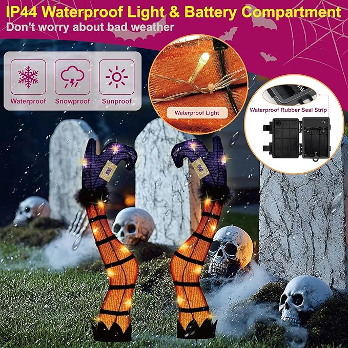 - 💀8 Lighting Modes & Timer: The lighted witch legs outdoor has 8 lighting modes for you to set. With timing function, press the button, the light will automatically stay ON for 6 hours and OFF for 18 hours every 24 hours. 3 AA Batteries operated, not including batteries.