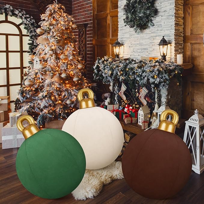 - Large Size: you will receive 3 pieces of inflatable velvet Christmas balls ornaments, featuring 3 colors, such as, khaki, brown, and green, these outdoor PVC Christmas decoration balls measure about 80 cm/ 32 inches before they are inflated, large enough to attract people's attention from a long distance, making your places full of Christmas breath