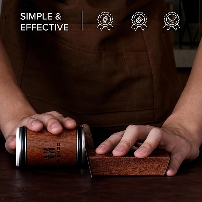 - 【Built to Last with Premium Materials】Crafted from walnut wood and high-grade industrial components, the roller knife sharpener blends timeless style with serious durability. It offers a smoother and safer experience compared to pull-through sharpeners.