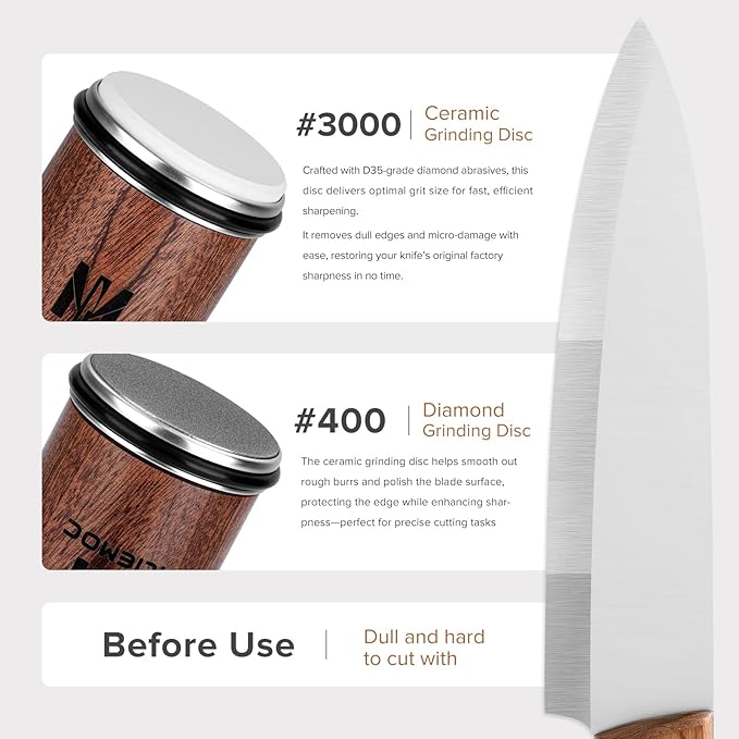 - 【Diamond & Ceramic Discs for Precision】Equipped with #400 diamond and #3000 ceramic wheels, the kitchen knife sharpener delivers lasting sharpness and a mirror-like polish. Use the diamond for reshaping, then refine with ceramic, ensuring serious, long-lasting performance.