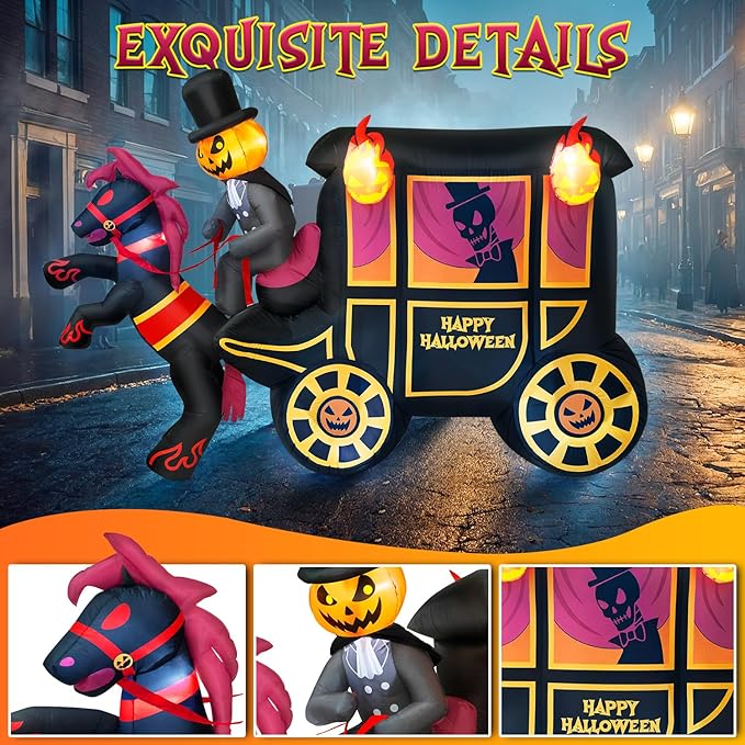 - 【8*9FT Halloween Inflatable Pumpkin-headed Coachman Whips Hell Horse Carriage Built-in Whole-body LED Lights】zukakii designed this Halloween decoration featuring an elegantly suited pumpkin-headed coachman whipping a phantom hell-horse and steering a ghostly carriage sitting a cackling skeleton baron. Built-in full-body LED cast spooky glow across the entire scene, making your Halloween Decorations the eye-catching of all the Halloween Outdoor party!