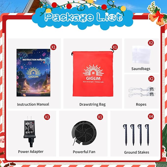 - 【Sturdy Installation Design】: Stays stable in wind! This Blow up Snow Man Yard Decor comes with 4 ground stakes, 3*2-meter ropes, and 2 sandbags. Fill sandbags, place inside before inflating—the Christmas inflatable snowman stands strong. Enjoy your inflatable christmas yard decoration with peace of mind!